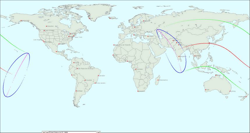 The Solar Maps eclipse map, on the other hand, does allow zooming in on the eclipse region, does show city names, and does depict partial eclipse lines very well. Its only weakness, which is nevertheless an important one, is that there is not enough width to the total eclipse line, so one cannot see exactly which cities are actually in the total eclipse zone.