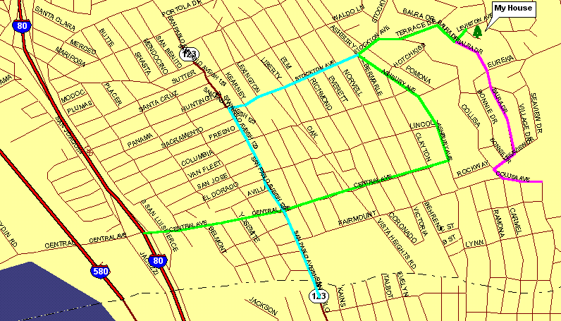 Directions to My Home Note: these directions are for those coming from Oakland or San Francisco, i.e. taking I-80 East past the Berkeley and Albany exits Follow the signs to get onto I-80 E. Take the CENTRAL AVE exit towards EL CERRITO At the end of the freeway ramp, Turn RIGHT onto CENTRAL AVE. Go about 0.9 miles, to the Top of CENTRAL AVENUE. Turn LEFT onto ASHBURY AVE. Go about 0.5 miles to the Second STOP sign. Turn RIGHT onto STOCKTON AVE. Go up THREE blocks bearing right at the fork (after the fork you're on Terrace Drive) Turn RIGHT onto BALRA DR. Take the first LEFT turn onto LEVISTON AVE. Park at the beginning of the Second Block. The house # is 7622 (Leviston Avenue). Walk up driveway, thru gate. If you need to call me for clarification, my number is 510-525-3399 Important Note: If you are coming from Marin then follow these directions: After getting off of the San Rafael-Richmond bridge into Richmond, travel approximately 10 miles on I- 580 East Take the CENTRAL AVE exit At the end of the freeway ramp, at the Stop sign, turn RIGHT onto CENTRAL AVE. Go about 0.9 miles, to the Top of CENTRAL AVENUE. Turn LEFT onto ASHBURY AVE. Go about 0.5 miles to the Second STOP sign. Turn RIGHT onto STOCKTON AVE. Go up THREE blocks bearing right at the fork (after the fork you're on Terrace Drive) Turn RIGHT onto BALRA DR. Take the first LEFT turn onto LEVISTON AVE. Park at the beginning of the Second Block. The house # is 7622 (Leviston Avenue). Walk up driveway, thru gate.