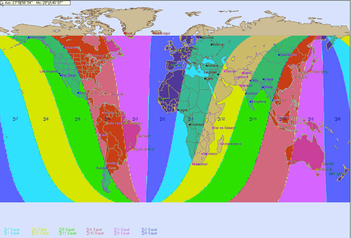 The Mountain Astrologer Review of HorizonsIn the June 2003 issue of The Mountain Astrologer, I compared and contrasted the astromapping features of eight different astrology programs. The present review introduces a brand new standalone astromapping program, called Horizons, with runs under Windows 98 (and later) versions of Windows, on PCs. As you might guess, Horizons isn't limited to the features that already exist in other astromapping software, it has valuable new astromapping capabilities. Like the other programs, Horizons offers a zoomable World map with Astro*Carto*Graphy and/or Local Space lines, the ability to view maps for specific regions (e.g. like the U.S. or Canada), Local Space and Relocated Charts, Paran listings, Eclipse maps, a full time-change atlas , and point-and-click interpretations. Horizons has many settings that you can customize to your preference including each of the colors in the map (the land, sea, rivers, cities dot and name, state borders, etc.) and line colors for each point (e.g. planets, nodes, houses, etc.) and for theme lines (more on themes later). You can create different color schemes for maps, and save and select the scheme you want to use. Horizons allows you to choose the current location, house system, zodiac (and ayanamsa), Parallax Moon position, True or Mean Node, and Geocentric or Geographic latitude. You can also add cities to maps. Maps can be copied to the clipboard (to paste into documents) and exported as bitmap (BMP) files; and reports can be saved in Adobe Acrobat (PDF), Hypertext Markup Language (HTML) and Rich Text(RTF) formats for emailing and publishing them. Horizons has many features that are similar to those already available, but which actually go beyond what is offered in the most advanced astromapping programs. For example it allows you to include aspect lines for any aspect set you create, and even to define new aspects. Similarly, if you choose to have the program display midpoint lines, you can select exactly which midpoints to include, with a choice of planets, angles, asteroids, Transneptunians, the comet Chiron, Lilith, and Transpluto. (You can similarly choose any of these points to display as aspect lines on the map.) Horizons also offers Theme maps. Theme maps show lines that indicate where to go to enhance specific life themes, such as romance, finances, family, career, etc. The reason why Horizons' theme maps are so useful is its Theme Editor, which makes editing themes and adding new themes incredibly easy to do. You can select what aspects and midpoints to use in each theme. Another important innovation in the creation and customizing of themes is the ability to add lines for specific house lords. You can use traditional or modern sign rulerships, or even create your own set of rulerships. As you move your mouse over a map, Horizons can display the longitude and latitude and/or the Ascendant and Midheaven positions and/or the name of the city at that location on the map. Neat! I particularly love the number of "mouse modes" in Horizons. Each specific mouse mode (chosen by clicking on an icon or through the Options menu), gives you a different response when you click on a map with your mouse. The mouse modes include the default zoom-in mode, local space, relocated wheel, distance measure, interpretations, and scoring graph. As you might expect, setting the mode to distance measure allows you to measure the distance on the map between any two points. Choosing the local space mode, on the other hand, enables you to click on any point on a map, and see the local space lines (for that birth date and time) radiate out from that location (as if it were the birth place). Zooming in is as simple as clicking on the area you want to zoom in on (and holding down the Control key while clicking on a map zooms you back out). If you select the Relocated Wheel mode, then as you move the cursor around the map and click on places, a chart wheel appears and is automatically relocated to each new place. Similarly, if you display a Local Space wheel, you can see that chart change as you click on each new place. If instead you select the Interpretations mode, then as you click on new places on a map, the interpretations are shown for each place. Very quick and useful. Horizons introduces the concept of scoring, in which, for any city or group of cities, the program displays a bar graph showing each city's degree of support for several different themes. See Figure 1: Scoring Graph: ![]() How themes are scored depends upon which map lines you turn on. If you only have rising/setting and culminating/anticulminating lines on, the graph takes those lines into account, in calculating scores. But if you turn on aspect and/or midpoint lines, they too influence the scoring for each factor. The program allows you to easily create lists of cities, and to view the scoring graphs for each place one after the other. As you can see from the example for Juneau, Alaska for my chart, there is a little bit of support for several themes, but emotions/Moon is fairly strongly supported, and foundations/Saturn is most strongly emphasized in this area. In Horizons' Quick Score mouse mode, each time you click on a place on a map, Horizons shows you the scoring for that place. Horizons breaks new ground in its introduction of two new compatibility chart mapping methods. The purpose of both methods of compatibility mapping is to find the best place for two people to live (or travel, or work, etc). The reason that Composite charts have never been mapped before is that Composite charts don't actually exist, i.e. there is no birth place (or even birth date). Horizons' programmers had to resolve this problem; they developed a new concept of how to map a Composite chart. What the program does in its Composite mode is to map the planets in the composite chart (of two people) by using the geographic coordinates of the first chart selected. The second compatibility 