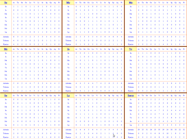 It contains nine tables, seven for the planets (other than the nodes), one for the lagna (ascendant),