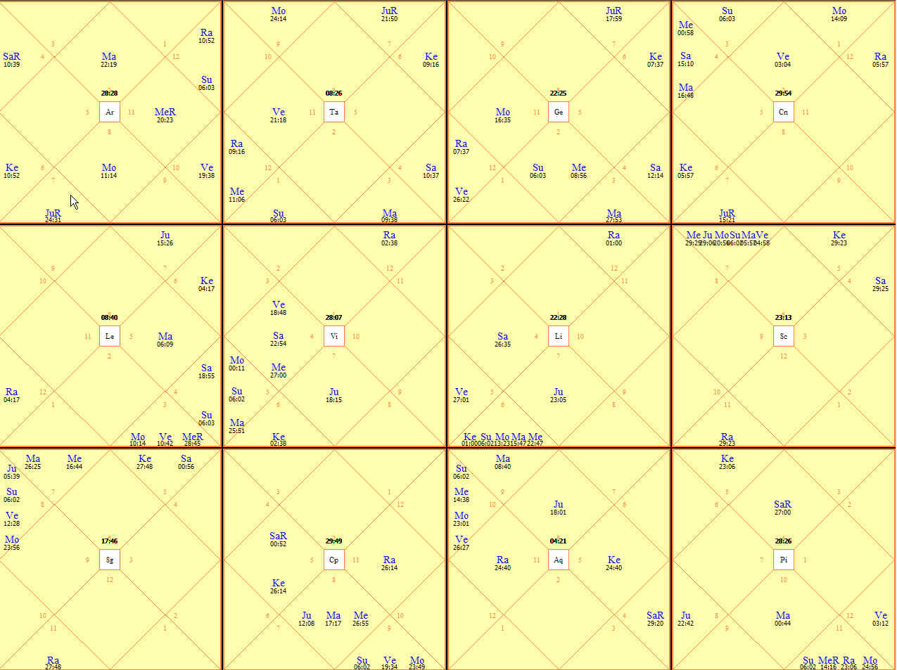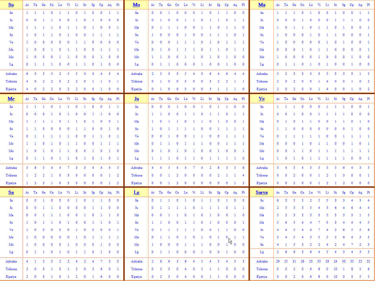 The Ashtakavarga screen supports astrologers making predictions based upon planetary transits. It contains nine tables, seven for the planets (other than the nodes), one for the lagna (ascendant), and one summation (Sarva) table. See Figure Four: The Ashtakavarga Screen.