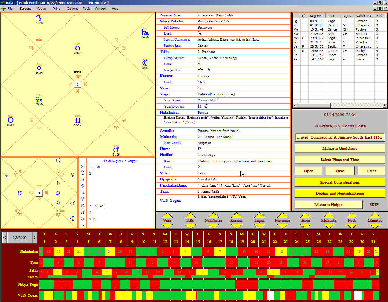 Among the most powerful and popular of the additions to Käla are the new Muhurta functions. [Note: What Western astrologers call Electional Astrology, i.e. choosing the best time to initiate an activity, event, or new undertaking, Vedic astrologers call Muhurta.]