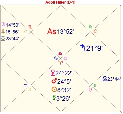 Adolf Hitler is a revealing example of the Lagnesha in the 7th house. He felt alienated from himself from childhood, believing that his blood was tainted by being a child of parents who were closely related. In fact, one of his brothers was sequestered for mental illness. Hitler's approach to war was revolutionary, and his powerful leadership abilities (however malignant) are also reflected by the 7th-house Lagnesha, Venus, which is weakened and destabilized, though, by being in a planetary war with malefic Mars.