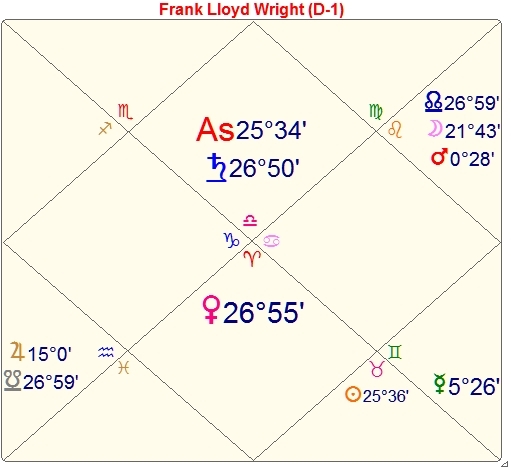 Frank Lloyd Wright, June 8, 1867; 5:00 p.m. LMT; Richland Center, WI, USA (43°N20', 90°W23'); A: from memory.