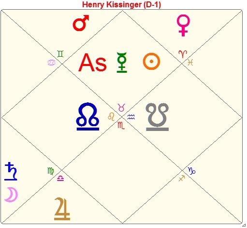 Henry Kissinger has the Lagnesha in the 12th house; he is renowned as a diplomat and mediator who has been greatly effective negotiating with foreign leaders. He has resided in foreign lands and conducted many "backroom deals." He was shy as a child (very common in the charts of those with the Lagnesha in the 12th house) and lived through a very insecure and traumatic childhood in Nazi Germany as a Jew, eventually fleeing with his family while he was still young.