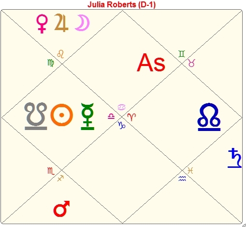 Julia Roberts is a good example of this position. She is seen as a great beauty (with benefics Venus, Jupiter, and the Lagnesha Moon all in this house); she has a great deal of wealth and is known for her loud laugh (another form of vocalization). But because of the weakness of the Lagnesa Moon (dark and waning), she was severely traumatized by the dissolution of her family after her parents' divorce.