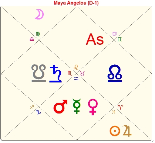 Maya Angelou's life deeply reflects many aspects of the Lagnesha in the 8th house. (See Chart 3.) Her childhood was incredibly traumatic, with her parents' divorce, the rape by a stepfather whom her family then murdered, her frequent relocation, early pregnancy, and more. Nonetheless, she became one of the most influential voices of the 20th century, even writing a poem for President Clinton's inauguration. She is seen as a pillar of wisdom, with the deep insight and courage to surmount all of the difficulties that life placed in her path, and she has helped countless others as well.