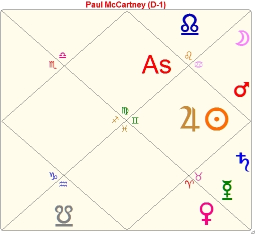 Sir Paul McCartney's life reflects his 9th-house Lagnesha very well. Paul's father championed his musical endeavors from an early age, and Paul was blessed to meet his fellow musicians and his manager when he was still an adolescent. His rise to fame and fortune was phenomenal, and like many with the Lagnesha here, he has given much to charity and supported idealisticpolitical and ecological causes. Publishing is a 9th-house matter, too; he has published not only a huge number of songs, but also films, poetry, artwork, and books. Even the guru theme of the 9th house played out in Paul's life: His pilgrimage to India and visits with Maharishi Mahesh Yogi were deeply enriching to him.