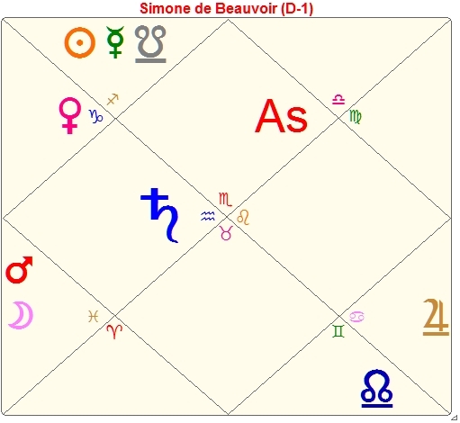 Simone de Beauvoir, January 9, 1908; 4:00 a.m. LMT; Paris, France (48°N52', 02°E20'); AA: birth certificate.