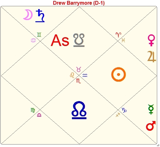 Drew Barrymore is an excellent exemplar of the Lagnesha in the 11th house. (See Chart 4.) She has had a relationship with "the masses" from the age of one, and has an incredible network of friends and supporters (e.g., Steven Spielberg is her godfather, and gave her the role in the movie ET). She became snagged by indulgence in drugs, sex, and alcohol, but she started rehabilitation in her mid-teens, and has steadily improved her life ever since. She has become a great financial success in the entertainment business as a founder and director of her own production company.