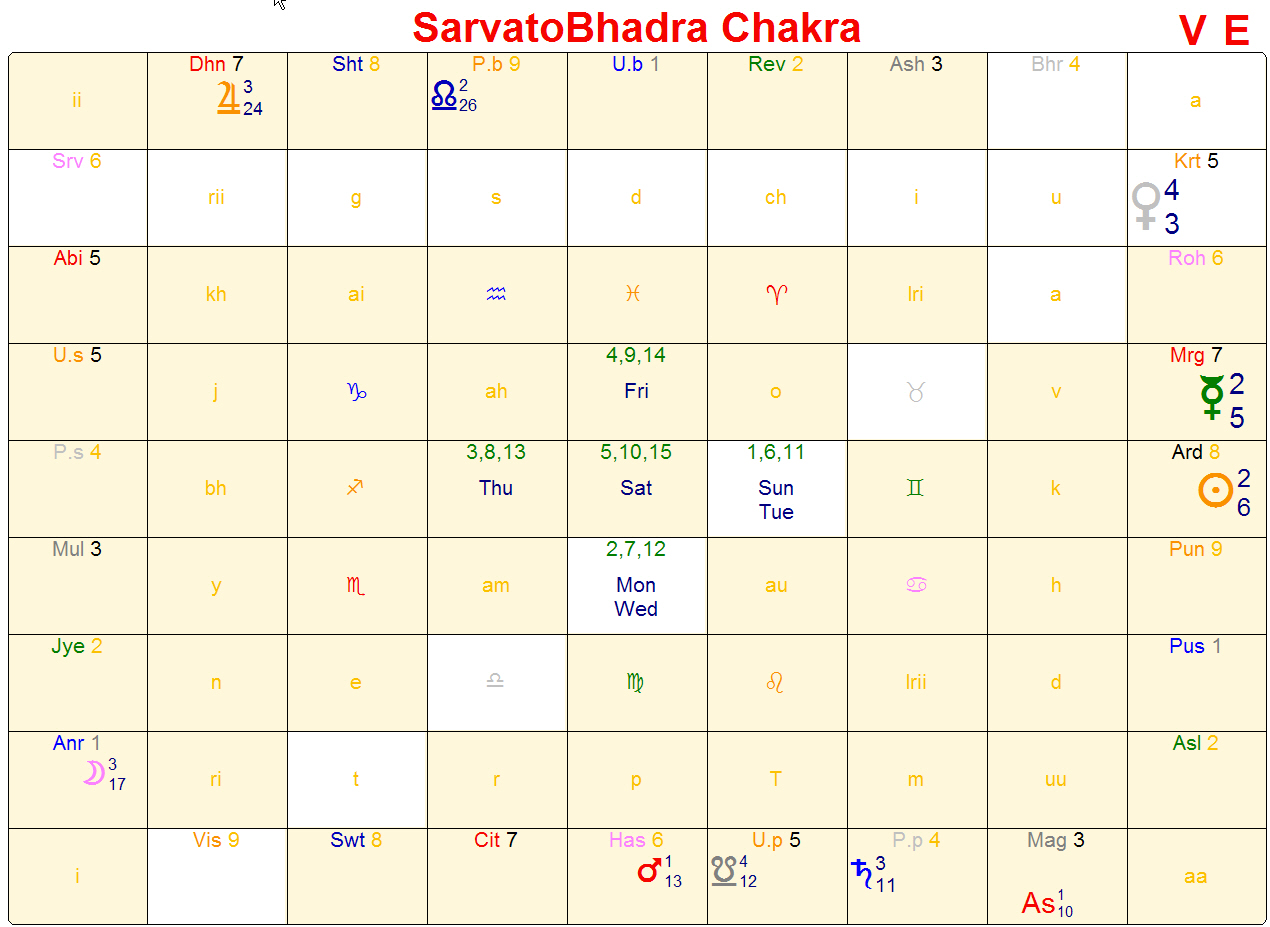 The Sarvato Bhadra Chakra allows you to click on any nakshatra or planet and see what planets, nakshatras, sounds, and days of the week it forms Vedhas (special aspects) on (see Figure Two). For example, you can see where the first letter of your name appears, and see if it's under any benefic or malefic influence from transiting planets. The Kota Chakra allows you to quickly see the Tara Bala values for each star, i.e. the auspicious and inauspicious placement of the planets with respect to the natal Moon. The Kala Chakra shows the Tithis (lunar days) and deities and rulers of the directions, and their connection with the planets. The program's extensive help section includes articles on the use of these chakras, a full glossary of Vedic astrological terms, and more. There is also an All Divisions Chart, which allows you to quickly switch between each of the divisional charts with a single click.