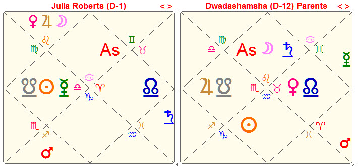 Here's Julia Roberts' natal and D-12 chart. The topic will be her Father.