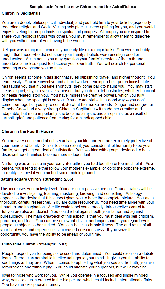 John Halloran, the author of AstrolDeluxe Report Writer (for Windows PCs) has just released a new set of delineations for Chiron. The author did considerable research preparing the Chiron interpretations and I found them exceptionally well written.